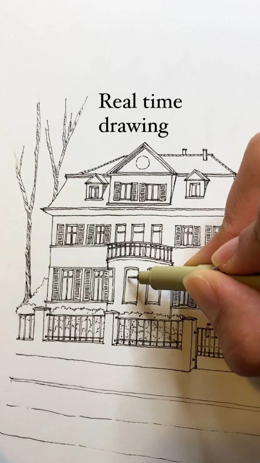 I usually draw on location with a pencil and then apply black ink at home, I prefer to elaborate the perspective with the subject in front of me, explore the initial feeling of the place, and at home I apply ink on it. But I do take pictures to have as a reference, it helps me finish the drawing. Everything is free hand, rarely I use a ruler.